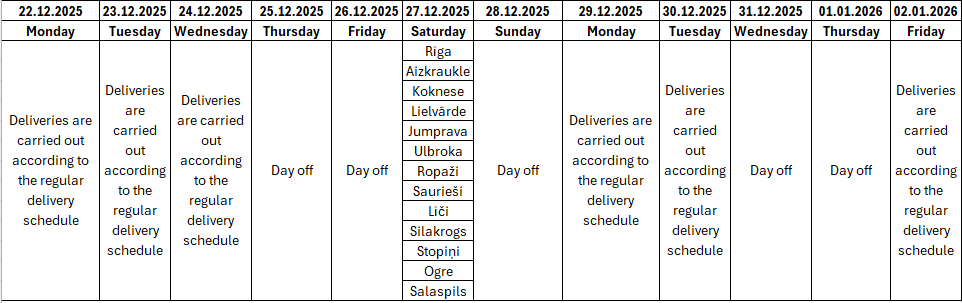 OUTSIDE RIGA, deliveries are made (on working days from 8:00 a.m. to 5:00 p.m.) according to the following schedule: