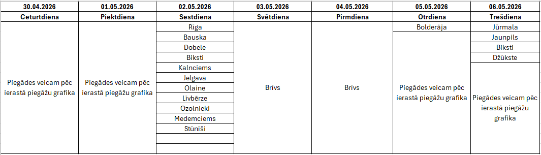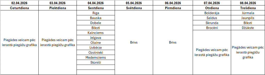 ĀRPUS RĪGAS piegādes tiek veiktas (darba dienās no plkst. 8:00 - 17:00) pēc sekojoša grafika: